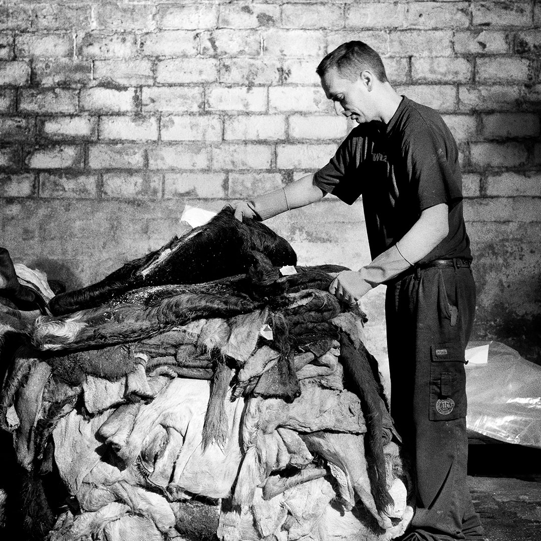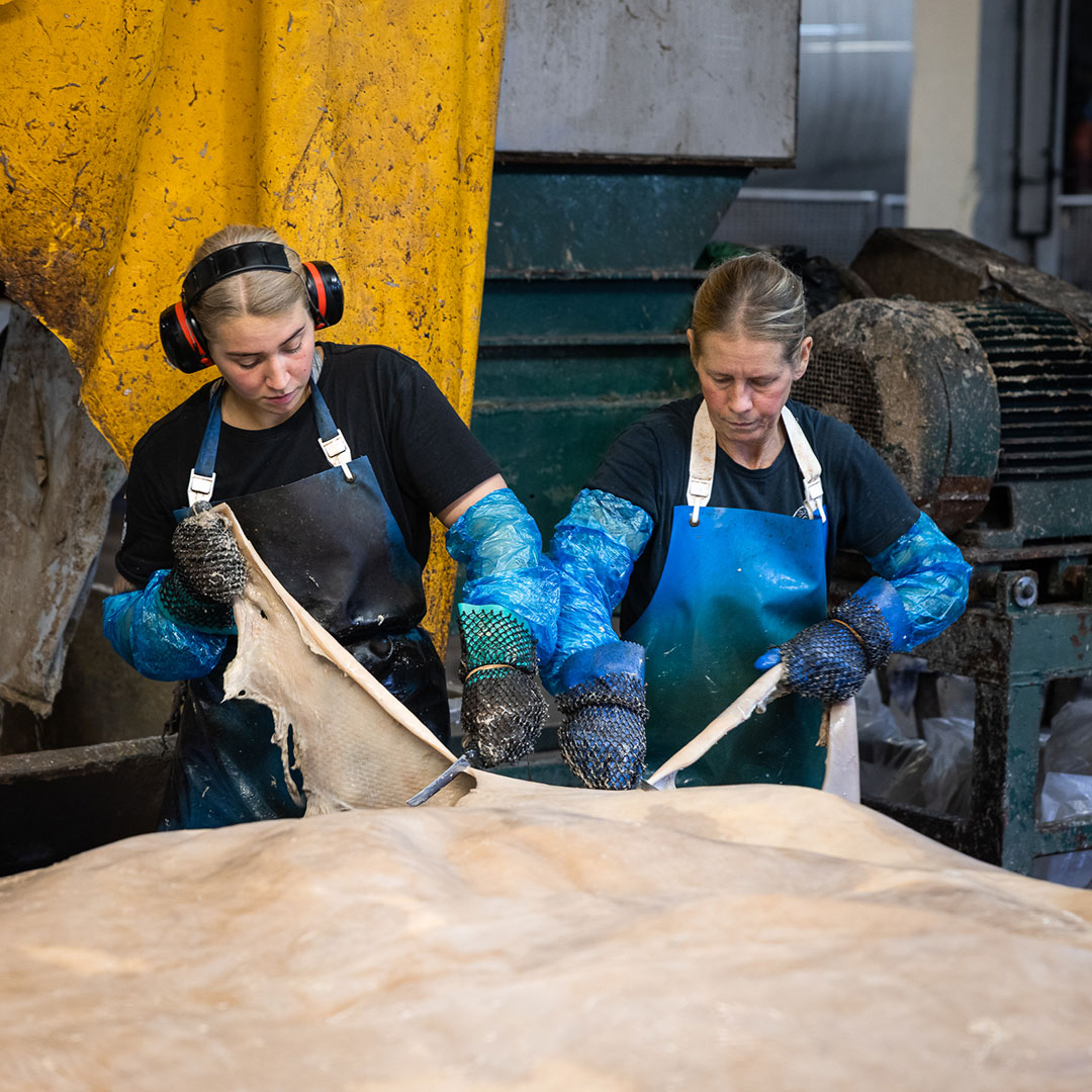 De avhårade hudarna körs sedan genom en skavningsmaskin för att ta bort rester som inte kan bli läder. Samtidigt görs en renskärning av våra erfarna hantverkare för att ta bort resterande delar som inte skall vara med på det färdiga lädret. De märker också partiet med ett unikt nummer för att göra det spårbart.