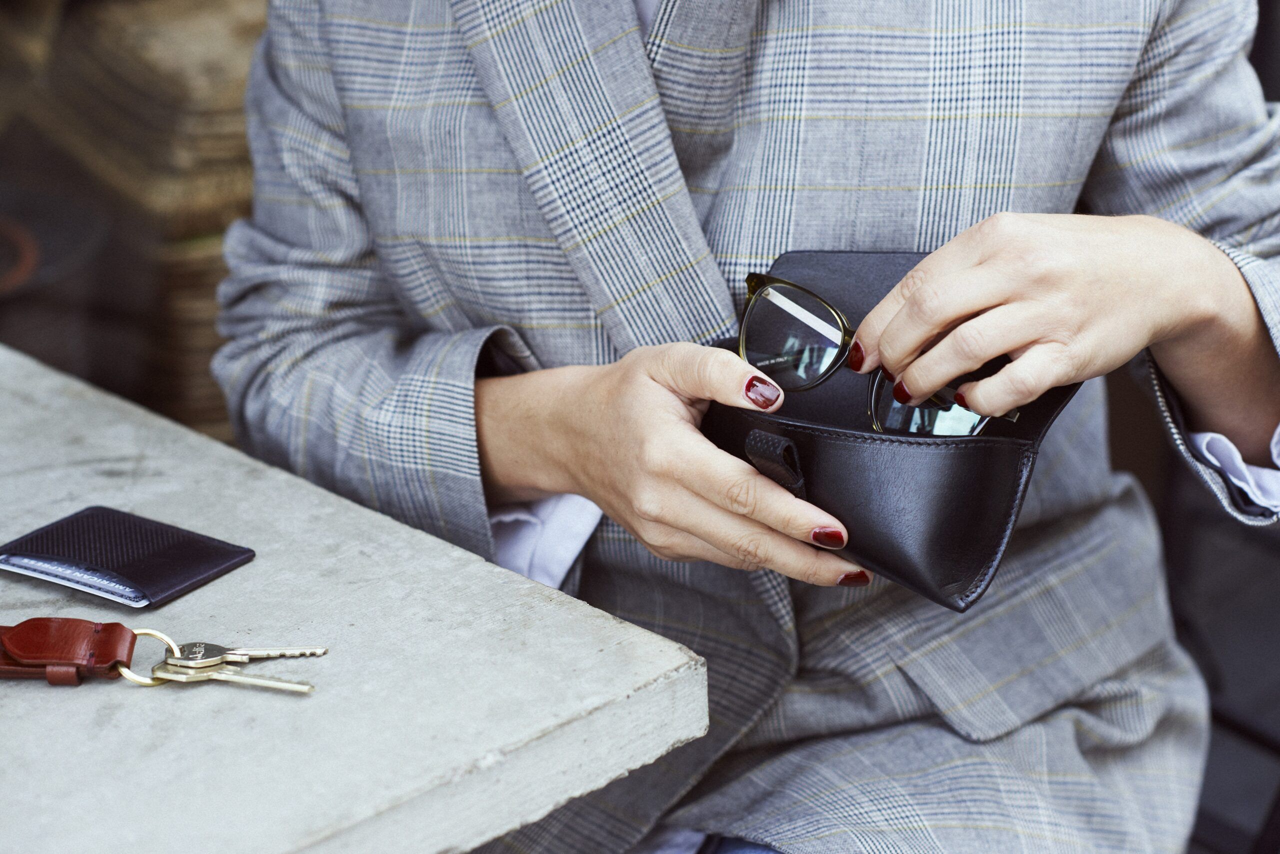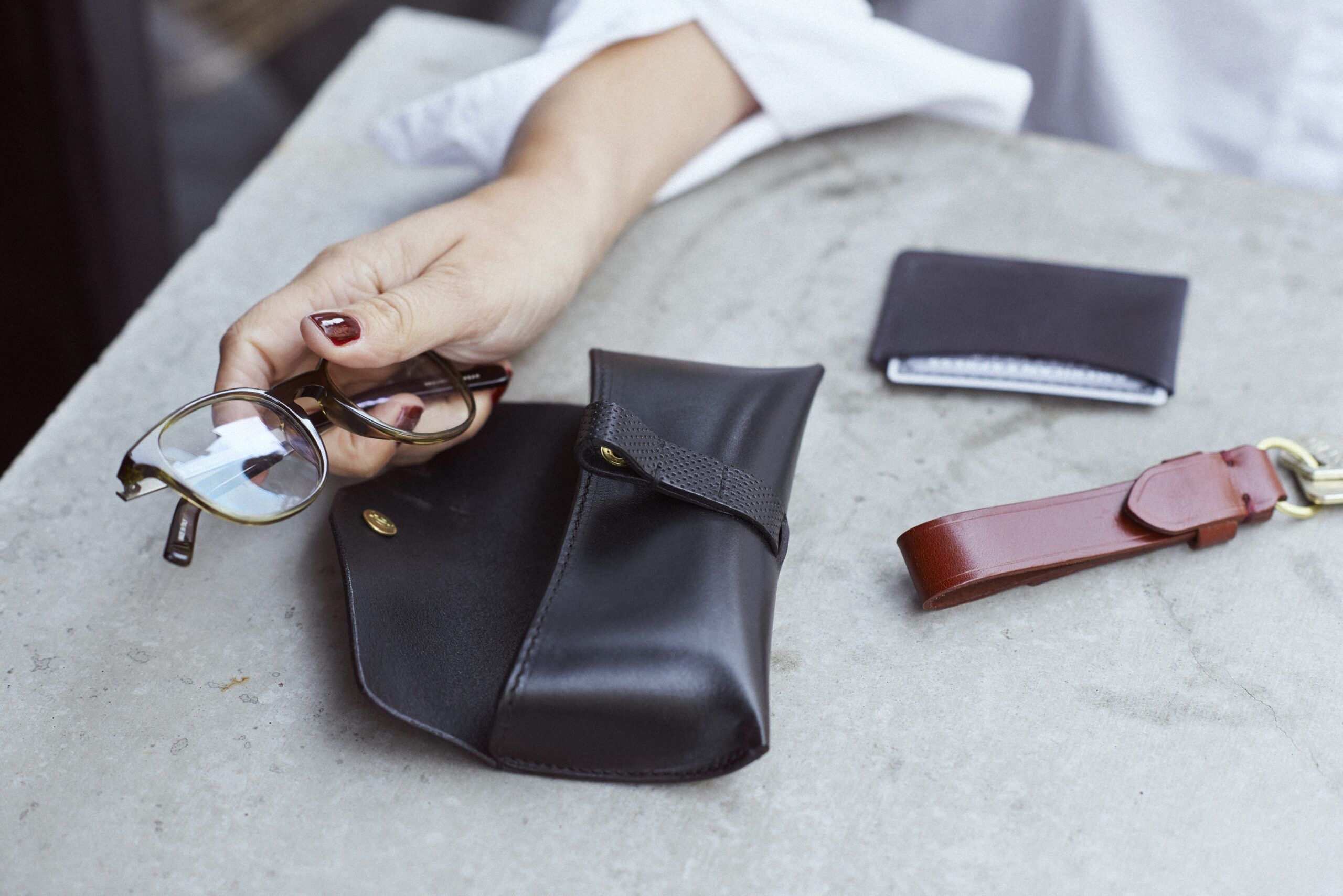 Glasögonfodral med TG1873-präglad rem. Fodrad med nubuck på insidan som är mjukt och anpassat för dina glasögon.
