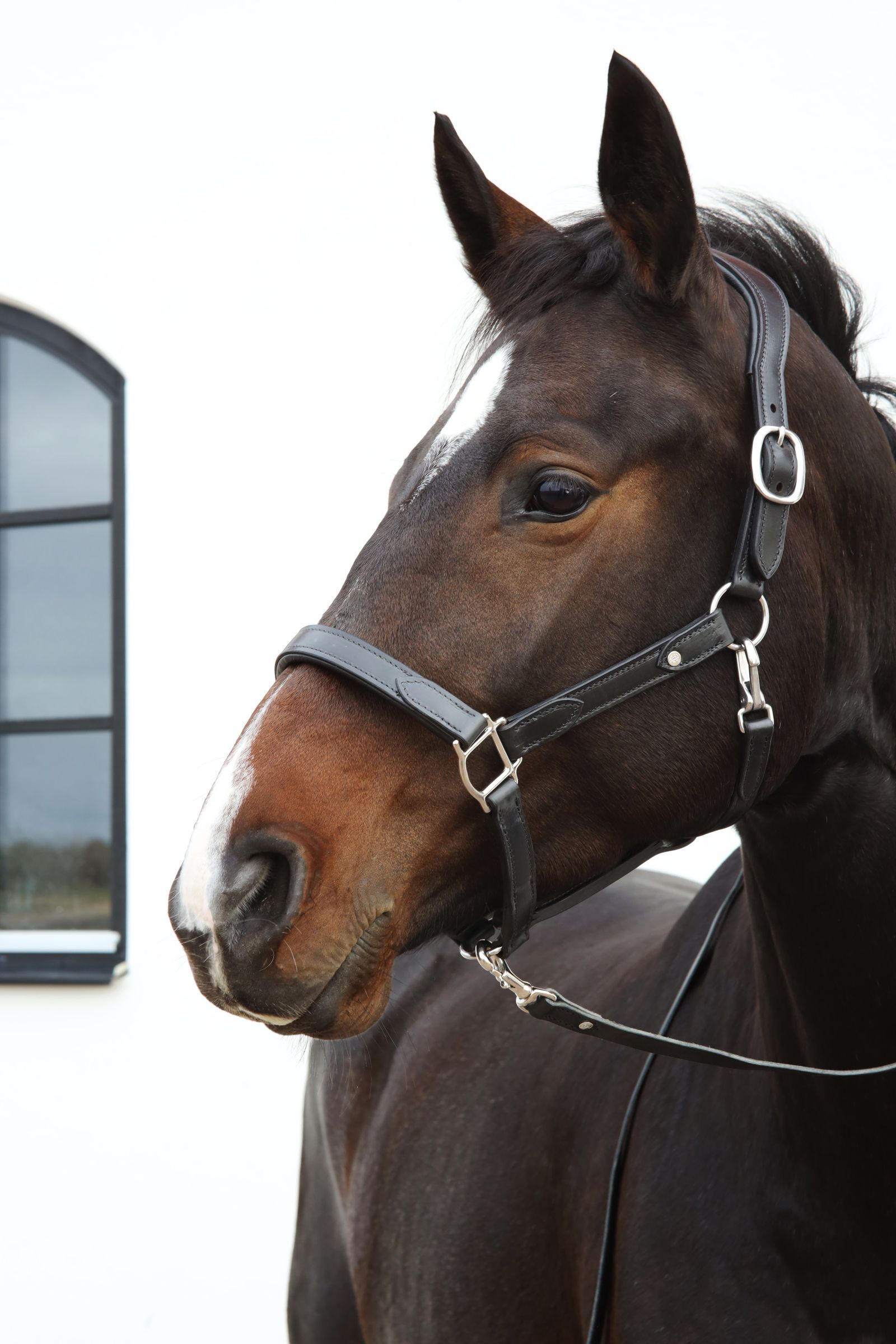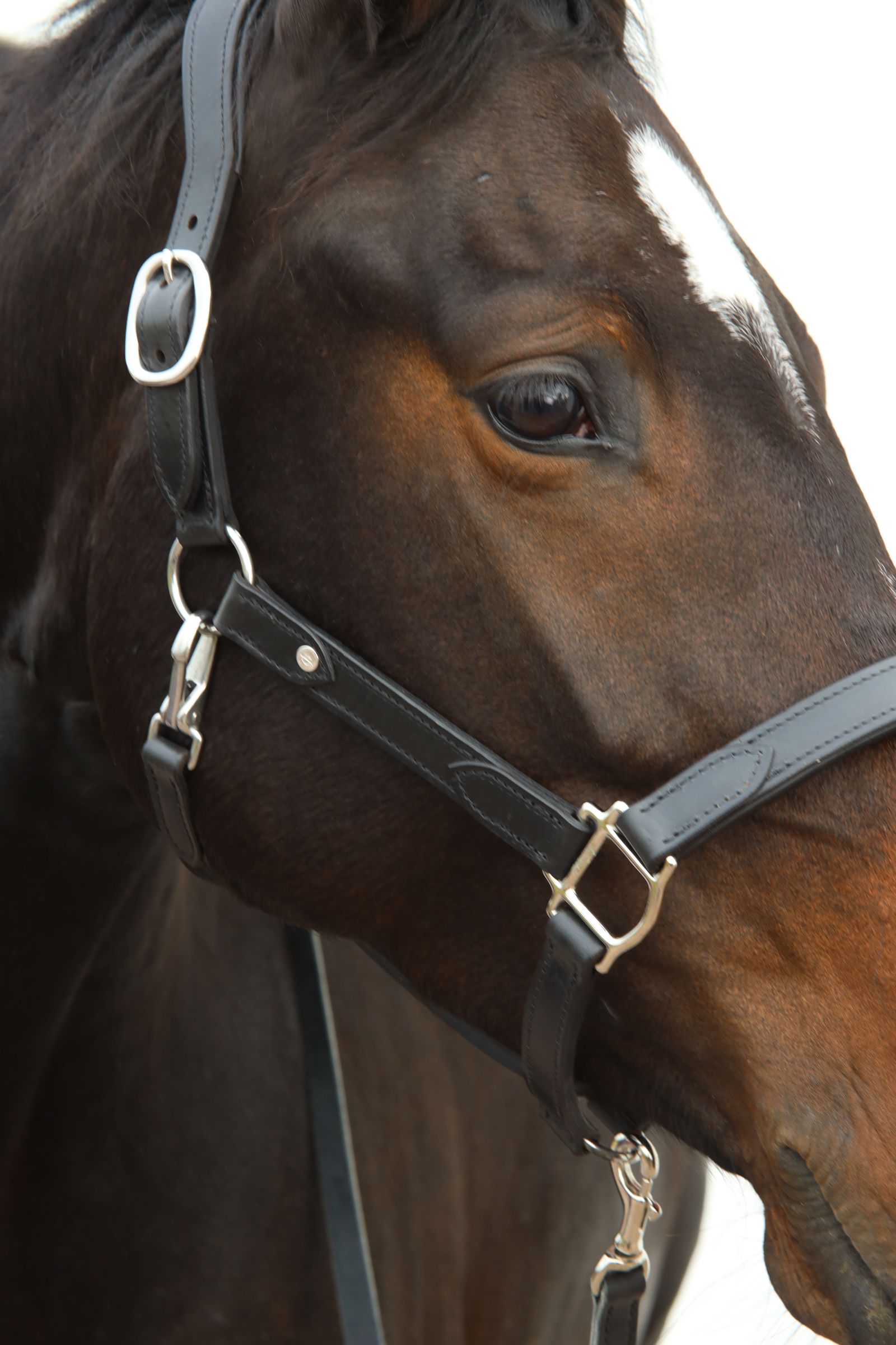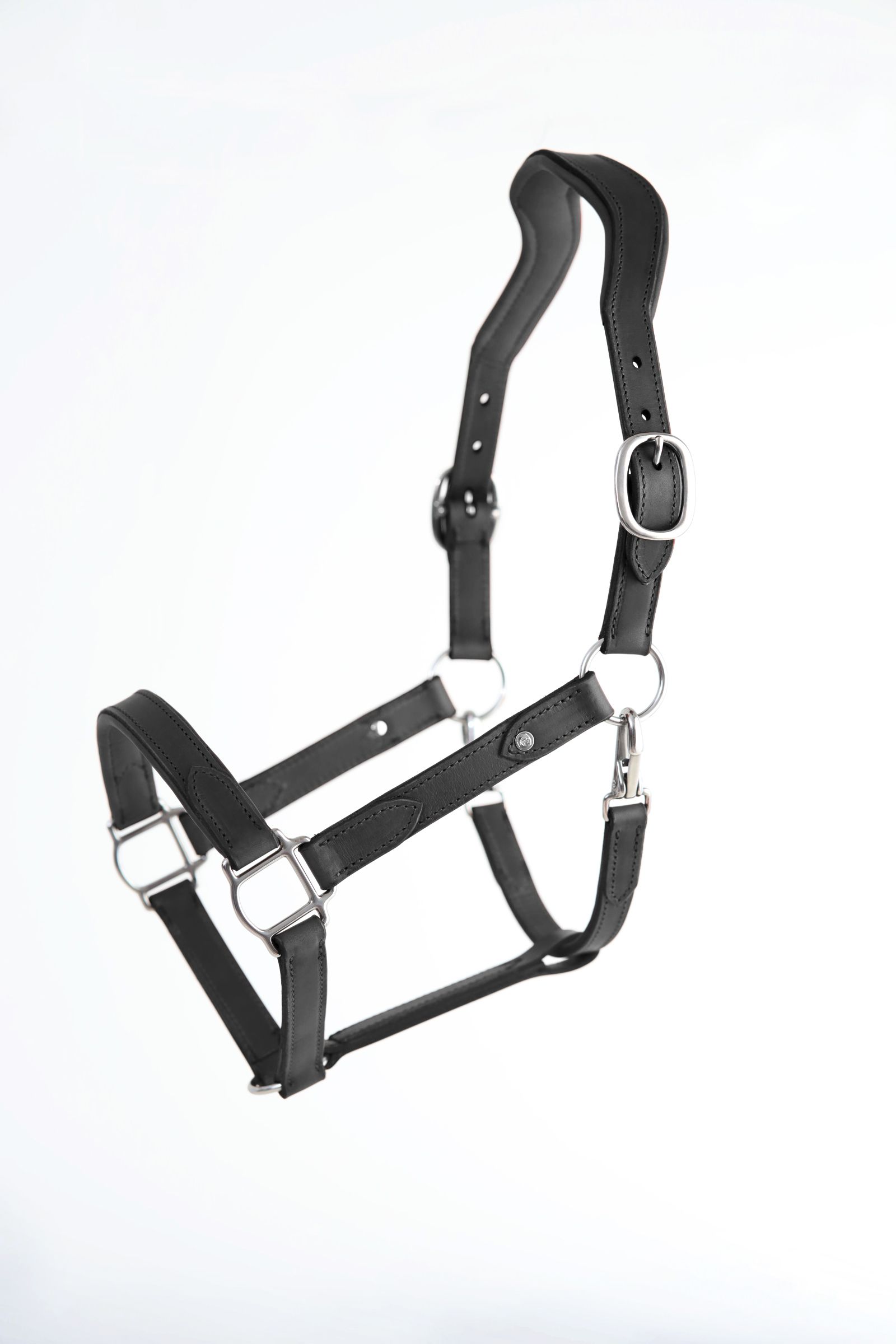Läderfodrat anatomiskt nackstycke samt nosgrimma, dubbla hakar för enkel avtagning i transport.