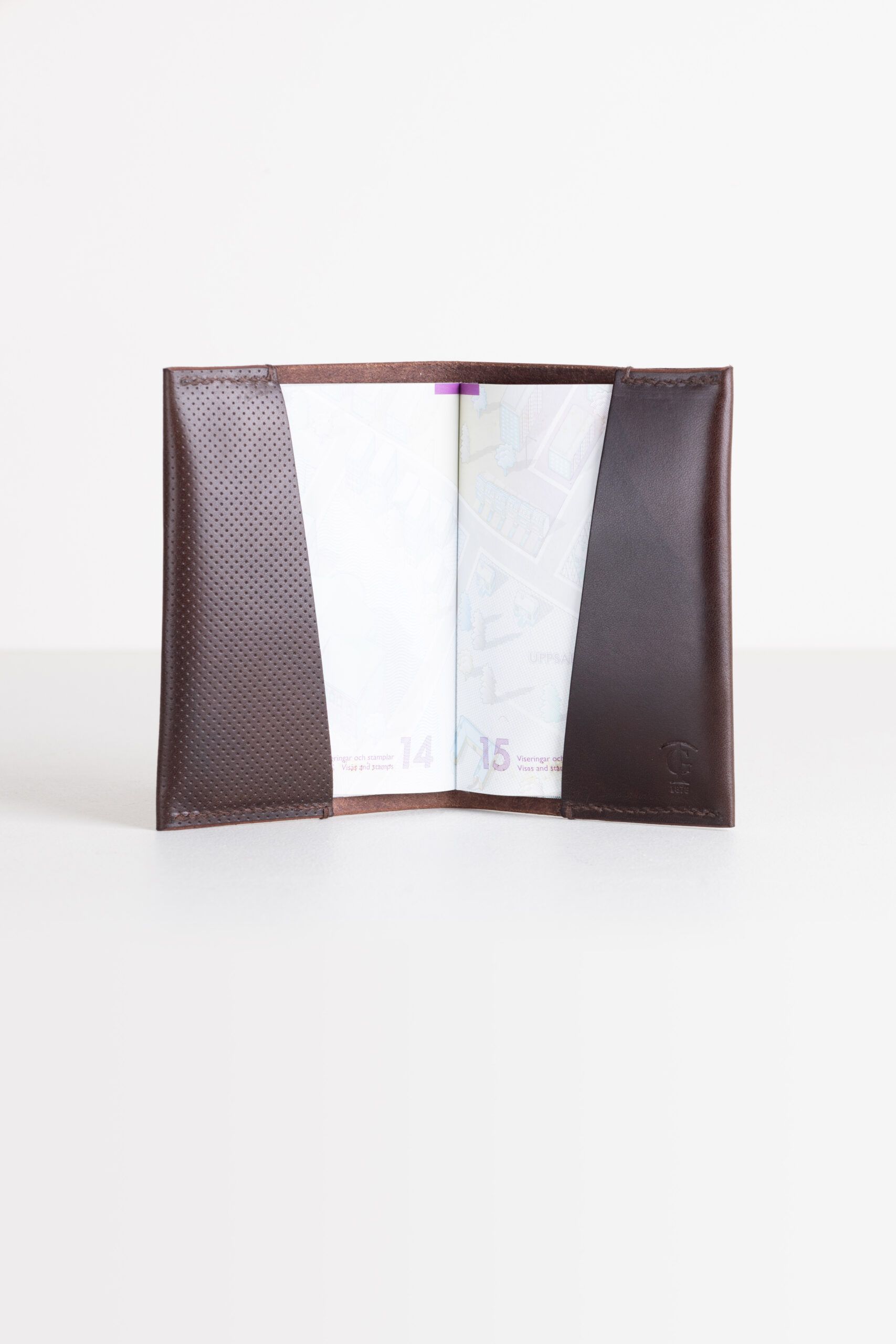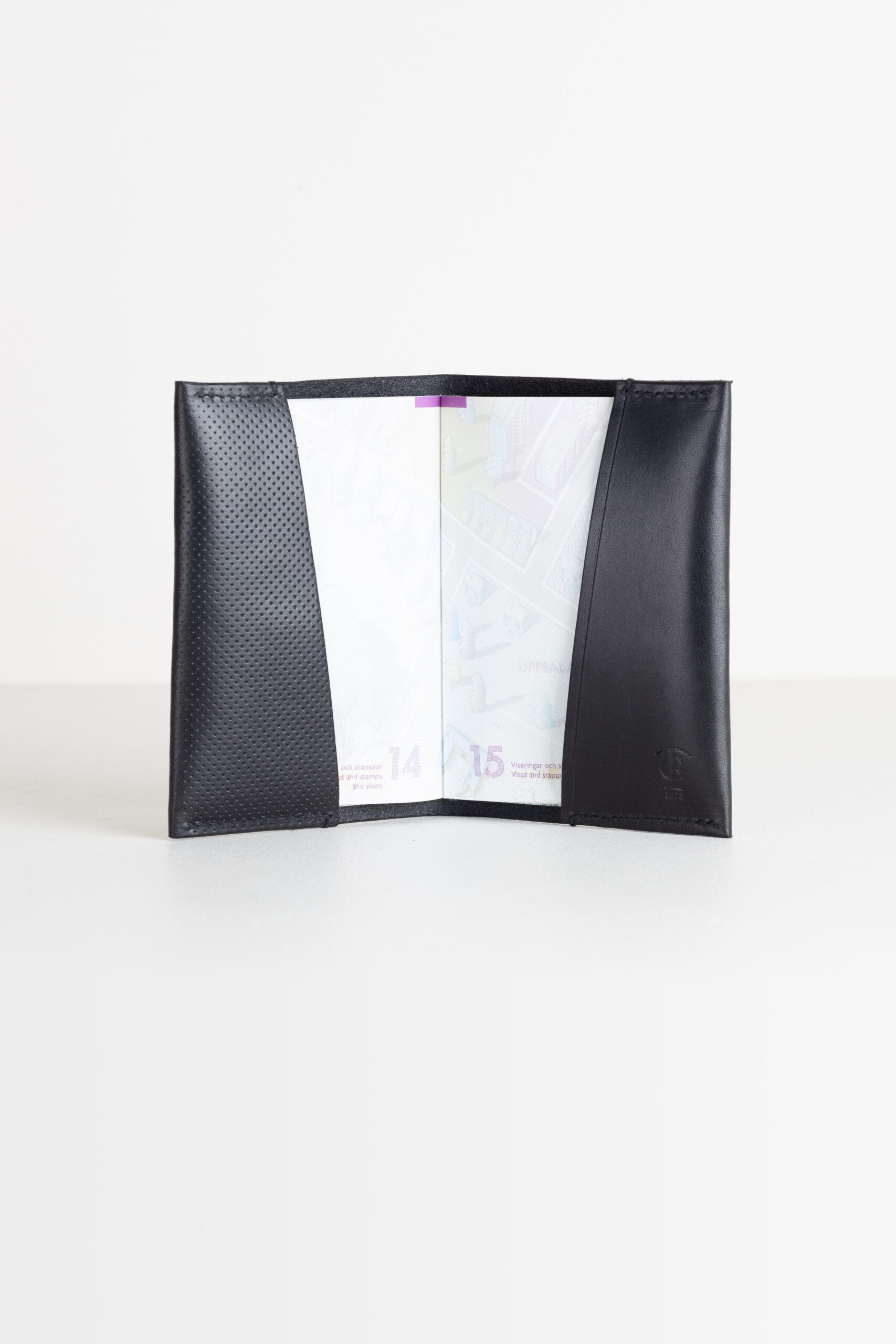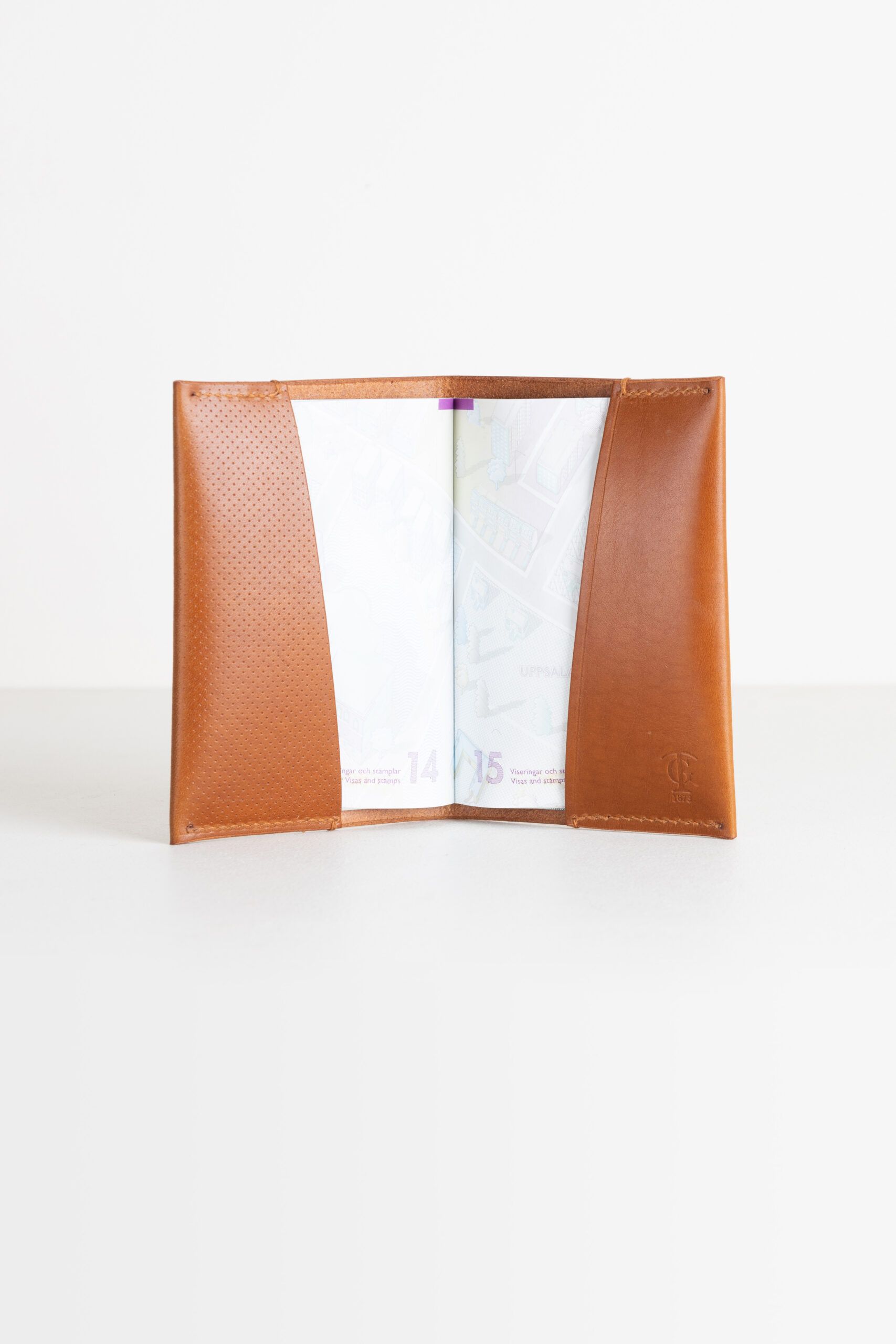 Ett smidigt passfodral med många vackra detaljer. Avsluten på sömmarna är gjorda för hand. De vikta kanterna där det präglade mönstret följer med narvlädret från utsidan till insidan skapar en sömlös känsla. Diskret logotyp i fodralets insida.